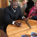 Schließlich öffnete Prosper eine Original-Kakaoschote und zeigte die -allerdings schon eingetrockneten- Kakaobohnen. Dann wurden Bio-Kakaobohnen und Kakaonibs probiert. Die Betreuer berichteten von der Wertschöpfungskette, die nur die einfache Produktion in der Elfenbeinküste läßt. Die teurere Folgeproduktion bis zur Schokolade machen die Konzerne dann in Europa und auch in Deutschland, das bringt richtig viel Geld ein. So konnte Prosper deswegen nicht zur Schule gehen: Die Plantagenbesitzer -hier sogar sein eigener Vater- verdienen nicht genug, um die Familien so zu versorgen, dass sie auch das Schulgeld für ihre Kinder haben.